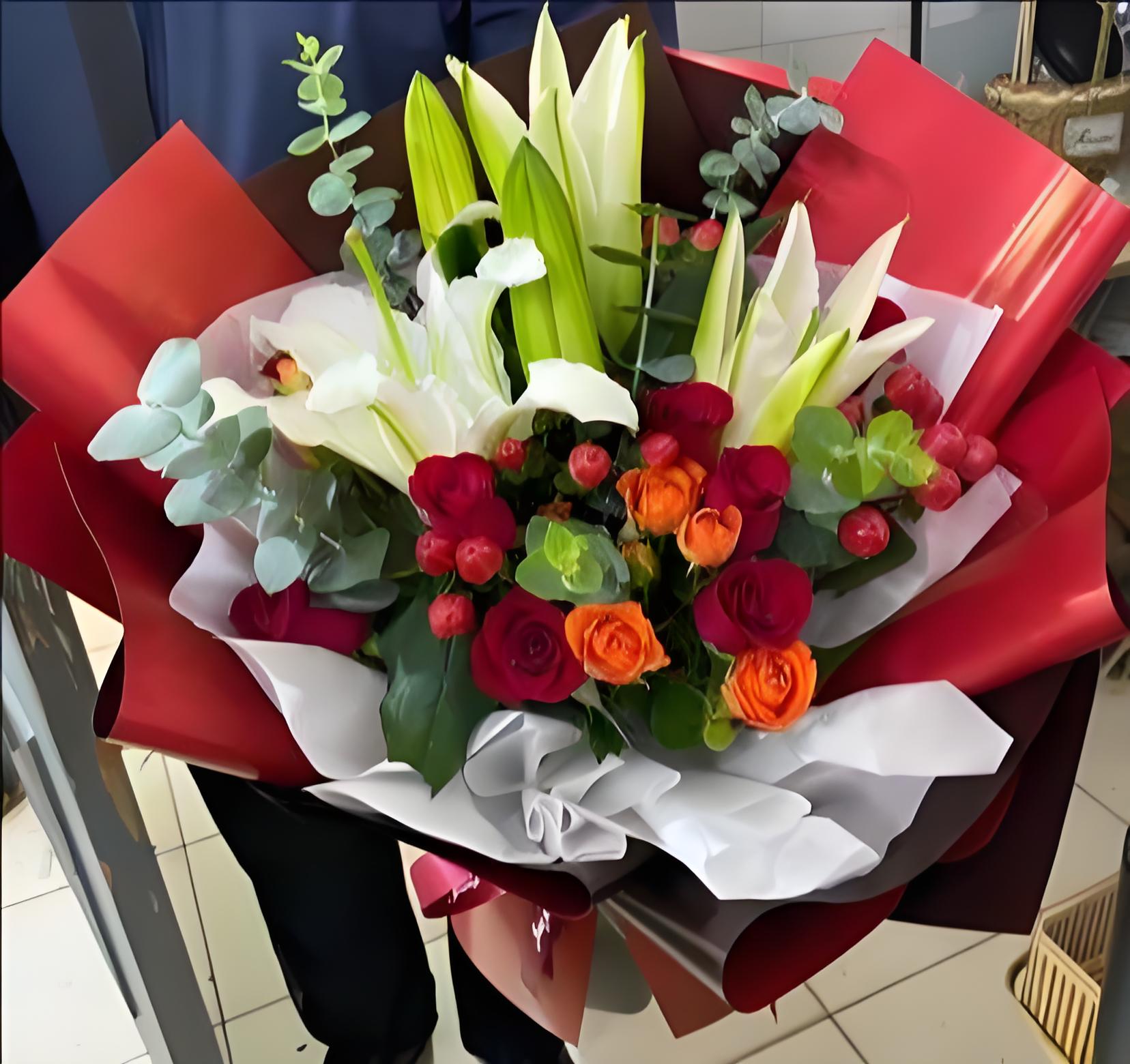 佛山花店包11枝红玫瑰、2枝多头白百合、6枝橙色多头玫瑰、红豆、尤加利叶